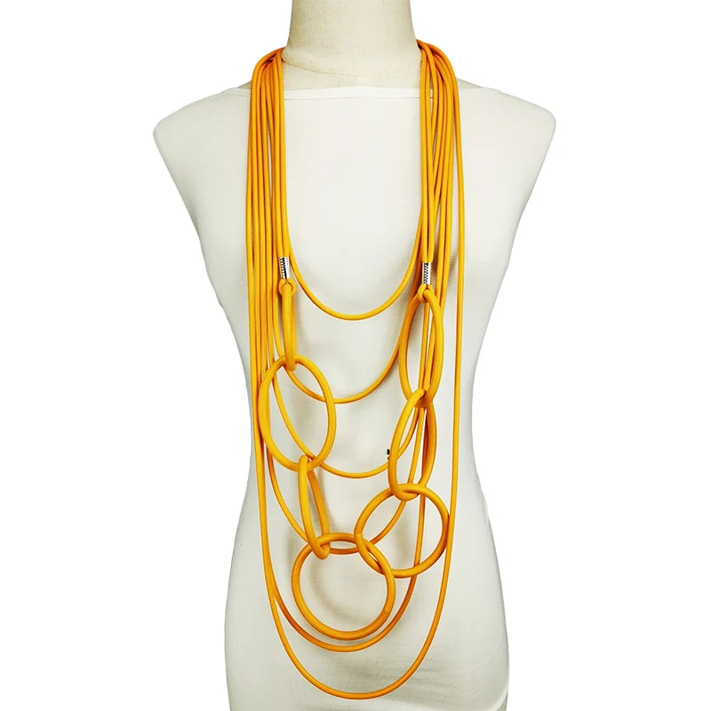Elevate your everyday style with this striking long pendant necklace, designed to make a statement with effortless elegance. The pendant features a modern, layered design of interlocking circular elements, creating a great sense of balance.